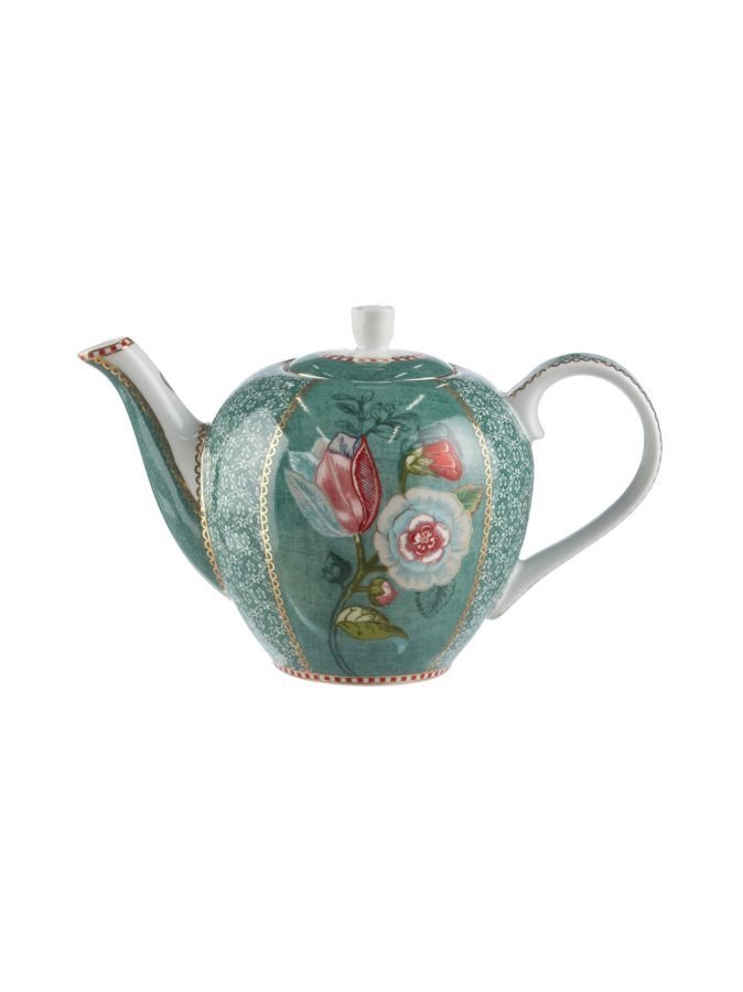 Hurmaavassa posliiniteekannussa on yksityiskohtainen kukkaiskuviointi sekä upeaa koristekultausta.