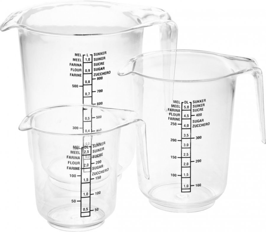 Mittakannu setti, jossa 3 kpl erikokoisia mittoja. Mittojen koot 0,25, 0,5, 1 l.