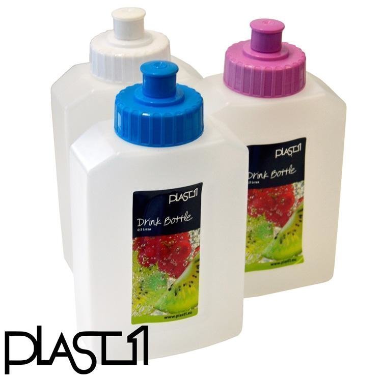 Juomapullo muovia 0,5 l. Korkin värit pinkki, sininen tai valkoinen. Valikoima voi vaihdella myymälöittäin.