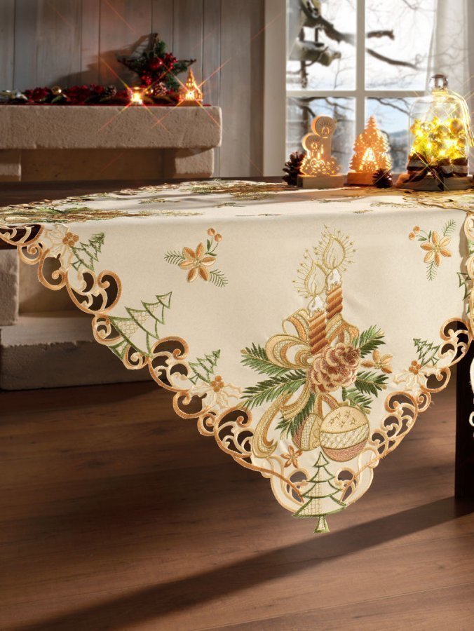 Pöytäliinasarja ’Joulukynttilä’, jossa on kaunista reikäkirjontaa sekä näyttävää kirjontaa. Materiaali 100 % polyesteriä. Sarjaan kuuluu erikokoisia liinoja, jotka on saatavissa erikseen.