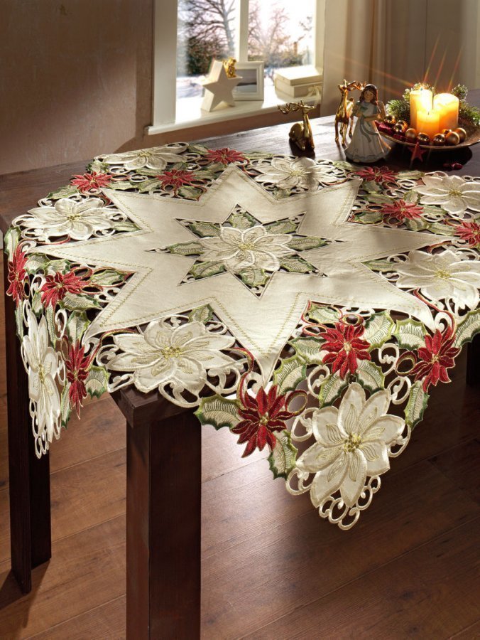 Jouluinen pöytäliinasarja, jossa on näyttävää kirjontaa. 100 % polyesteriä.