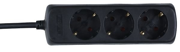 Jatkojohto kolmella pistokkeella. Kankaisella johdolla varustettu 2 m pitkä jatkojohto on maadoitettu.