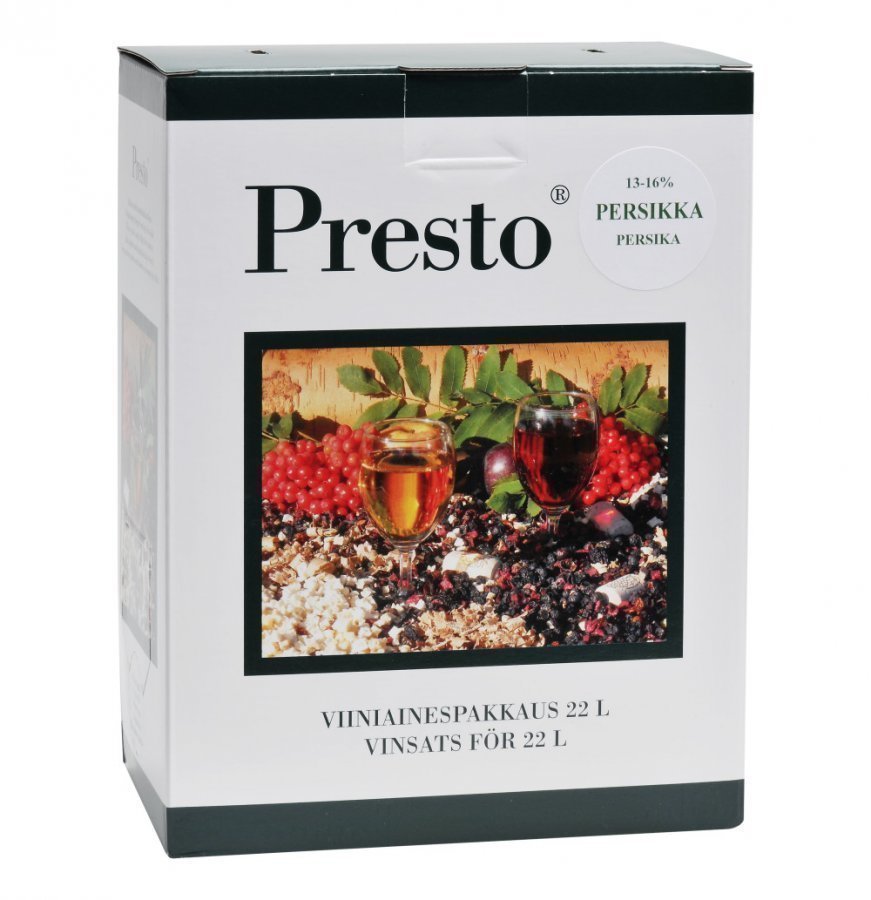 Persikan makuinen PRESTO Viiniainepakkaus sisältää marja/hedelmäseoksen ja kaikki tarvittavat käymisaineet viinin valmistukseen. Kotelo toimii itsessään hanapakkauslaatikkona 3 litran hanapussille: Laita täytetty 3 litran hanapussi laatikkoon ja vedä hana esiin kotelon sivuun painettavasta reiästä. Laske viini hanasta. Ominaisuudet: Raikas seurusteluviini ja myös mahtava boolinpohja. Väri kauniin punertava. Väkevä Persikka valkoviini 13-16% (Makeussuositus +5. . . +20) Huom! Alkoholituott. . .