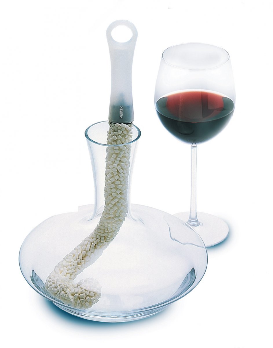Kahva muovia, pitkä, pehmeä ja dekanterin muotoon taipuva harjaosa absorpoivaa nukkaamatonta materiaalia. Voidaan pestä astianpesukoneessa. Lahjapakkaus. Pesun jäljiltä dekanterissa on kalkki- tai muita jäämiä, jotka aiheuttavat sivumakuja viiniin. Siksi dekanteri kannattaa aina pesun jälkeen puhdistaa huolellisesti dekanteriharjalla.