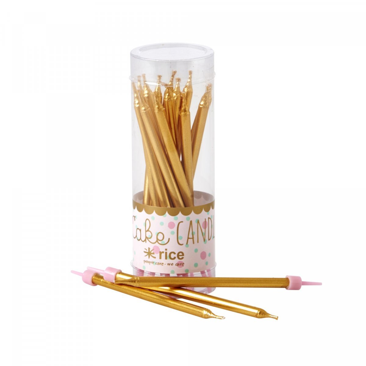 Setti kullanvärisiä kakkukynttilöitä kakun koristeeksi, Settiin sisältyy 16 kappaletta kynttilöitä.