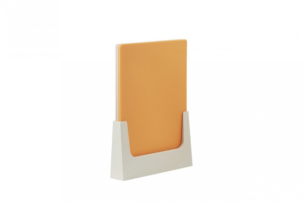 Leikkuulaudat tulevat kätevässä telineessä, jonka avulla saat pyyhkäistyä pilkotut raaka-aineet leikkuulaudalta paistinpannulle tai kattilaan. Leikkuulaudat ovat konepesun kestävät.