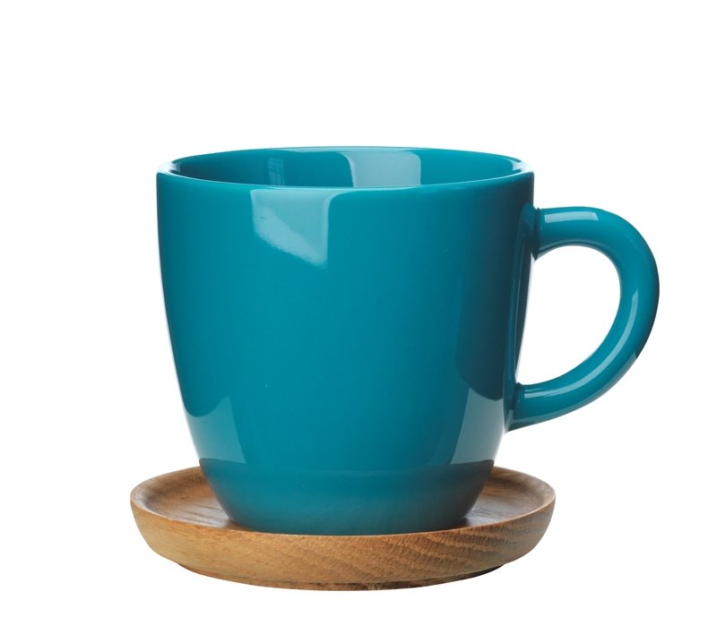 Keraaminen Höganäs-kahvimuki, jonka vetoisuus on 33 cl. Mukin mukana tulee puusta valmistettu aluslautanen, mikä estää pöytää likaantumasta ja se toimii myös mukin kantena.
