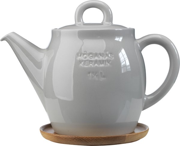 Keraaminen Höganäs-teekannu, jonka vetoisuus on 1,5 l. Kannun mukana tulee puusta valmistettu aluslautanen, joka estää pöytää likaantumasta ja metallista valmistettu siivilä. Yhdistä kannu saman sarjan mukeihin ja luo kauniita iltapäivätee kattauksia.
