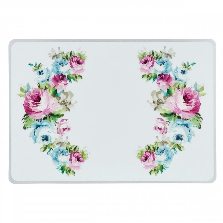 Muovitabletti, jossa painettuja kukkakuvioita. Koristeellinen ja suojaa pöytää. Helppo pyyhkiä puhtaaksi kostealla rätillä.