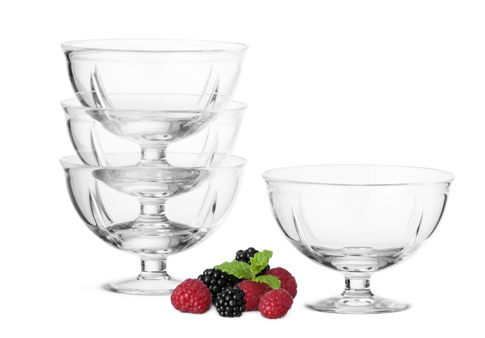Neljä jalallista kulhoa Rosendahlilta, joiden korkeus on 8,2 cm. Kulhot on valmistettu lasista ja ne toimivat niin jälkiruoka- kuin tarjoilukulhoina. Kulhojen muotoilu on yksinkertaista ja tyylikästä, minkä ansiosta ne on helppo yhdistää saman sarjan muihin astioihin.