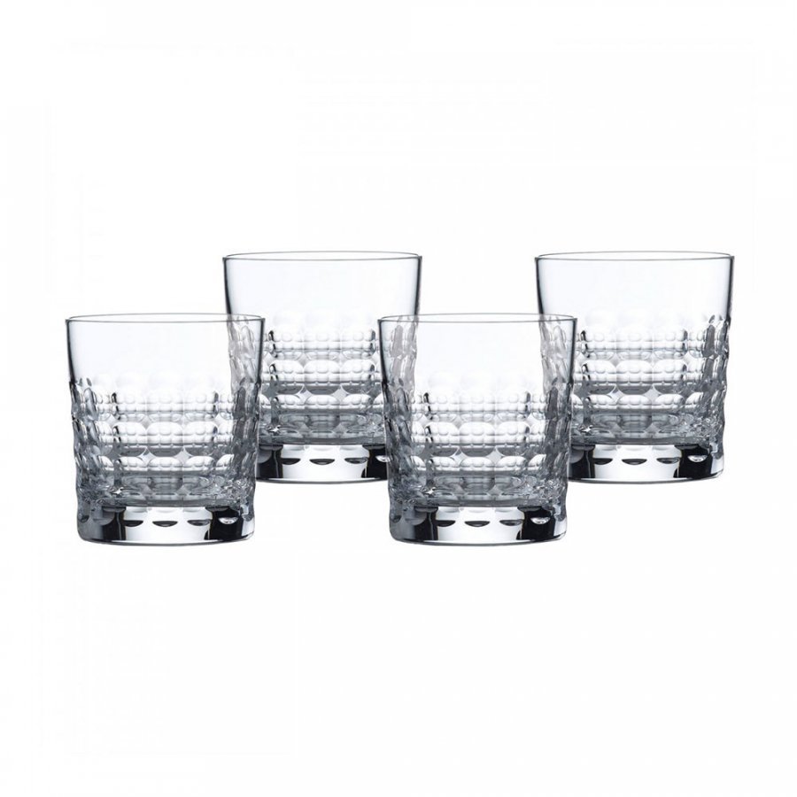 Tässä nykypäiväisessä neljän tumbler lasin setissä on pyöreitä ympyröitä, jotka antavat modernin vaikutelman.
