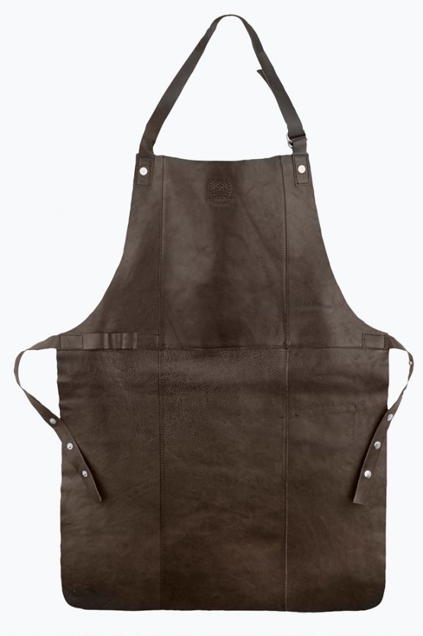Saddler Apron -esiliina paksua nahkaa. Kaistaleista ommeltu malli, säädettävä remmi ja metallisolki niskassa. Vyötäröllä säädettävä remmi ja painonapit. N. L 53, x K 74,5 cm. 100% nahkaa