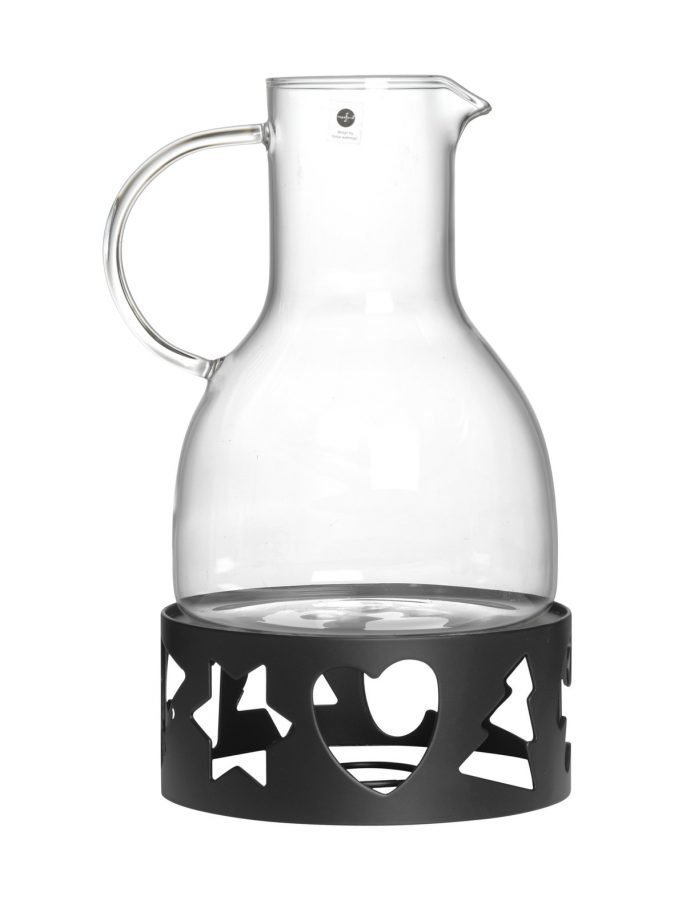 Elegantisti muotoiltu glögikannu on konepesunkestävää lasia. Kannun mukana tulee metallinen lämmitin, jonka kynttilätuikku pitää kätevästi juoman kuumana. Kannun tilavuus on 1,3 litraa.