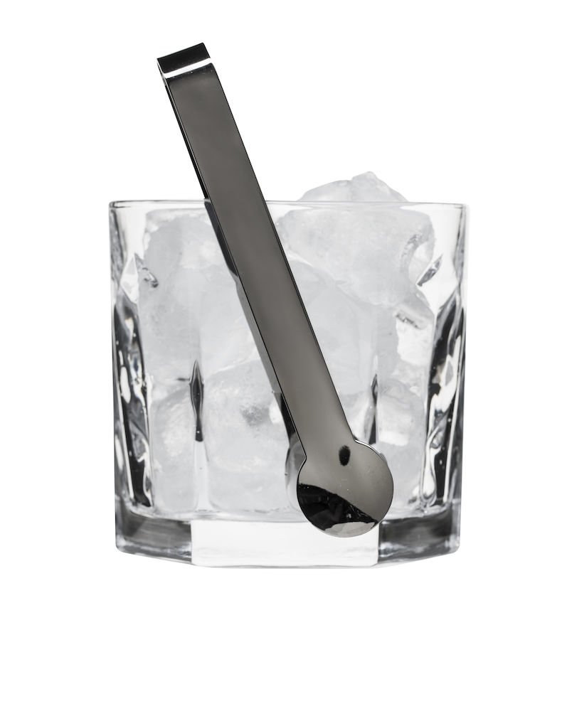 Lasista valmistettu elegantti jääpalakulho, jonka mukana tulee ruostumattomasta teräksestä valmistetut pihdit. Molemmat osat ovat konepestävät.