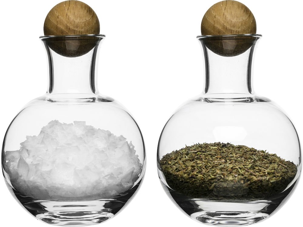Lasista valmistettu tarjoilusetti mausteille, minkä mukana tulee tammesta valmistetut korkit. Tarjoile suosikki mausteet aterian yhteydessä, jotta jokainen voi itse lisätä mausteita oman maun mukaan.
