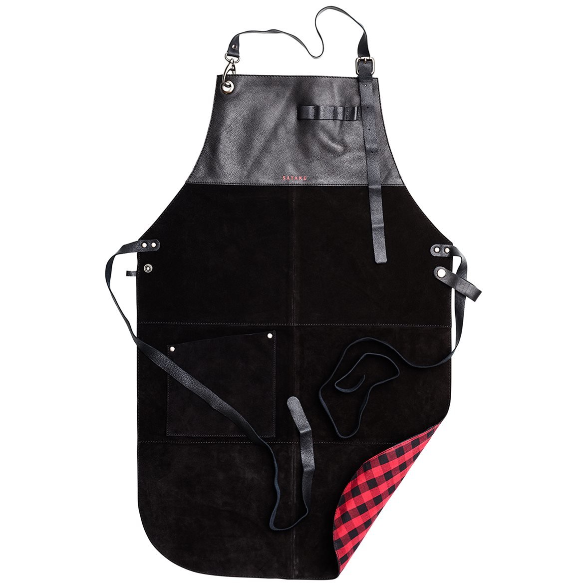 Sataken musta ja mokkainen esiliina, kankaisella vuorella joka on väriltään punamusta. Esiliinassa on pidike digitaaliselle lämpömittarille ja muille pienemmille työvälineille ja suuri tasku kookkaammille keittiövälineille. Huolto-ohje: Kuivaa tahrat kostealla rätillä ja kuumalla vedellä. Älä käytä kemikaaleja, pyykinpesu- tai tiskiainetta.