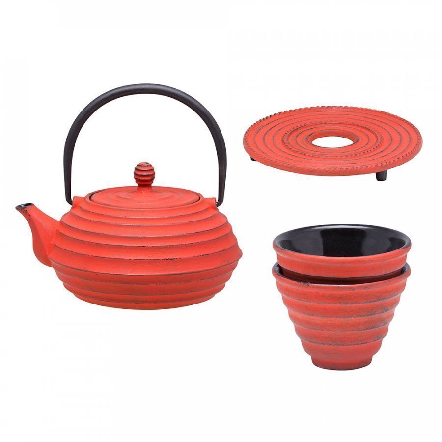 Punainen teesetti. Sisältää: Teekannu 0,8 l, valurautainen alunen ja 2 valurautaista mukia.