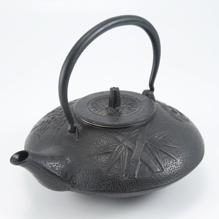 Musta valurautainen teekannu.