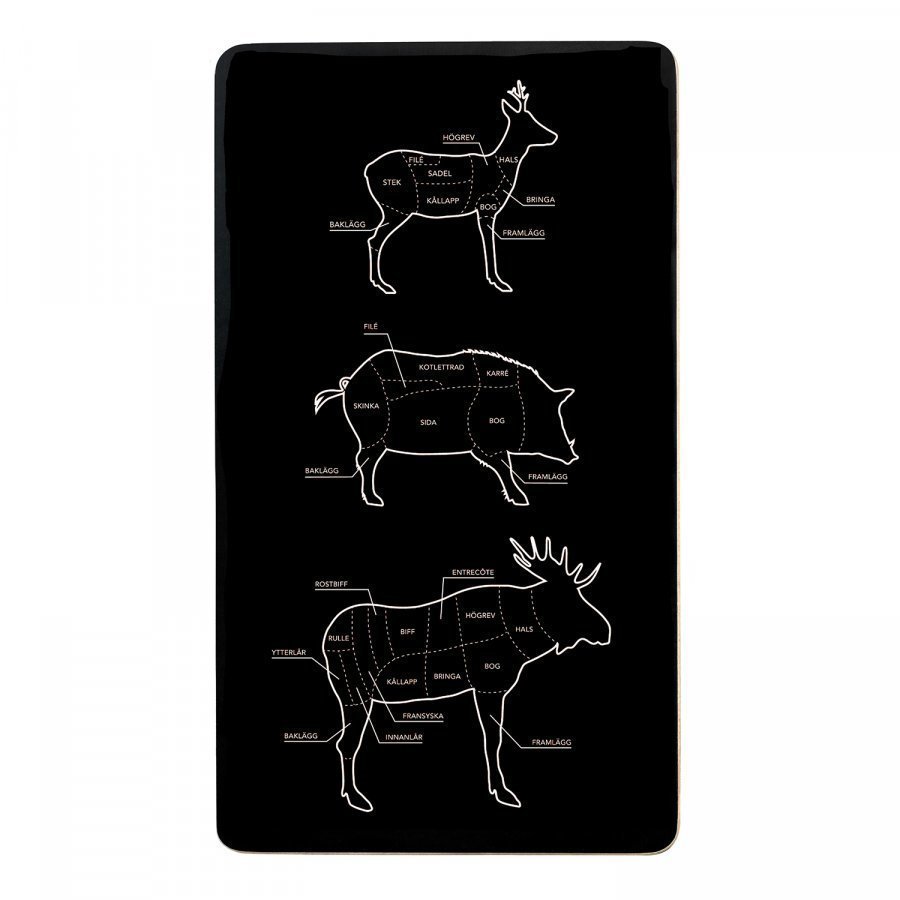 Hunters Edition leikkuulauta merkiltä Scandinavian Design Factory. Tämä ihana malli on jatkoa klassiselle leikkuulaudalle Styckdetaljer. Tässä versiossa on 3 metsästäjän suosikkia: metsäkauris, villisika ja hirvi! Pintaan piirrettyihin eläimiin on merkitt