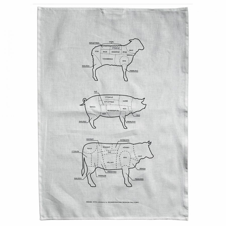 Keittiöpyyhe, jossa on kuvattuna yleisimpien ruokaeläinten paloitteluosat.
