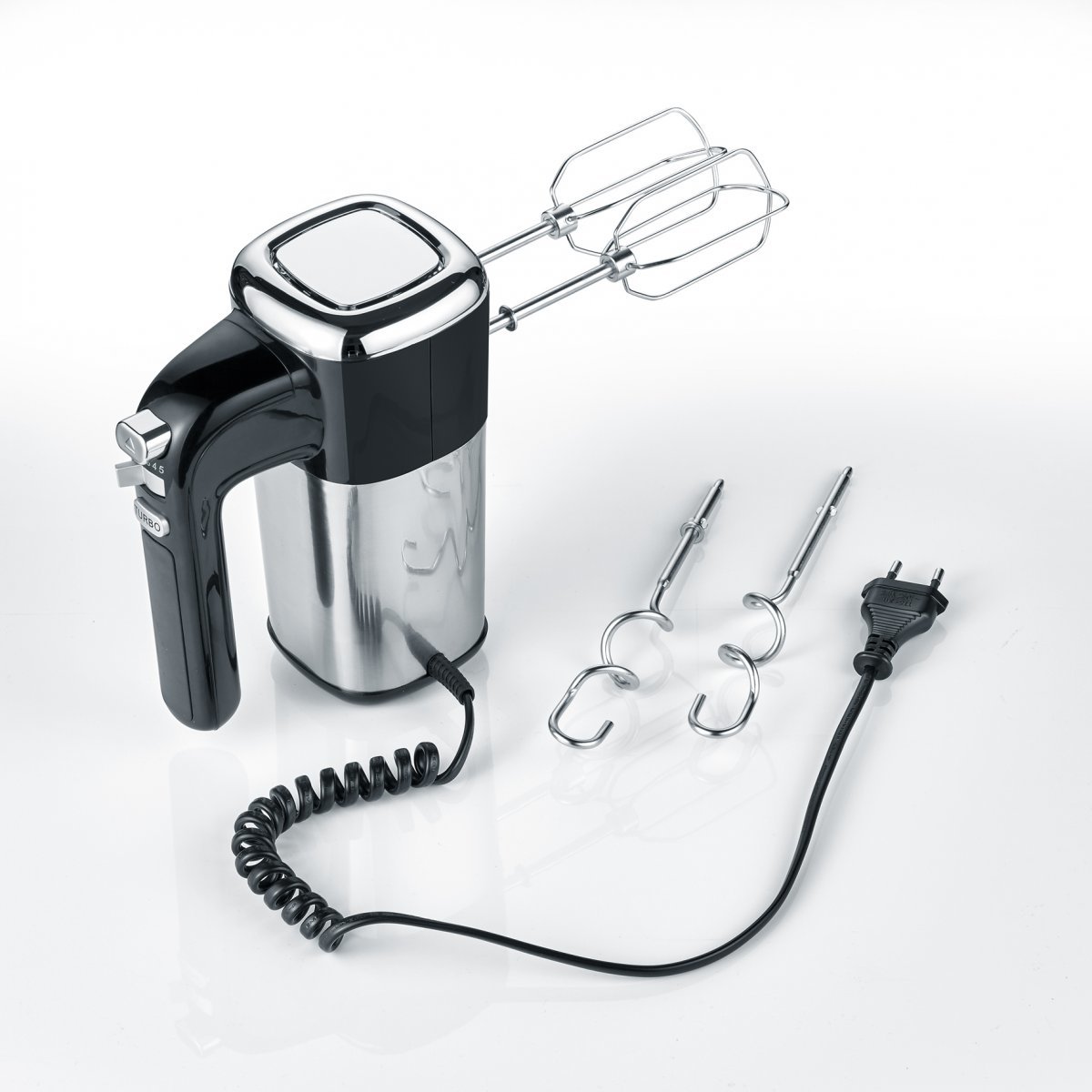 Sähkövatkain yksityiskohdilla ruostumattomasta teräksestä. Vatkain varustettu spiraalijohdolla, jotta vatkainta on helppo liiikutella. Teho: 400W . 5 nopeusasetusta . Vispilät ja taikinakoukut.