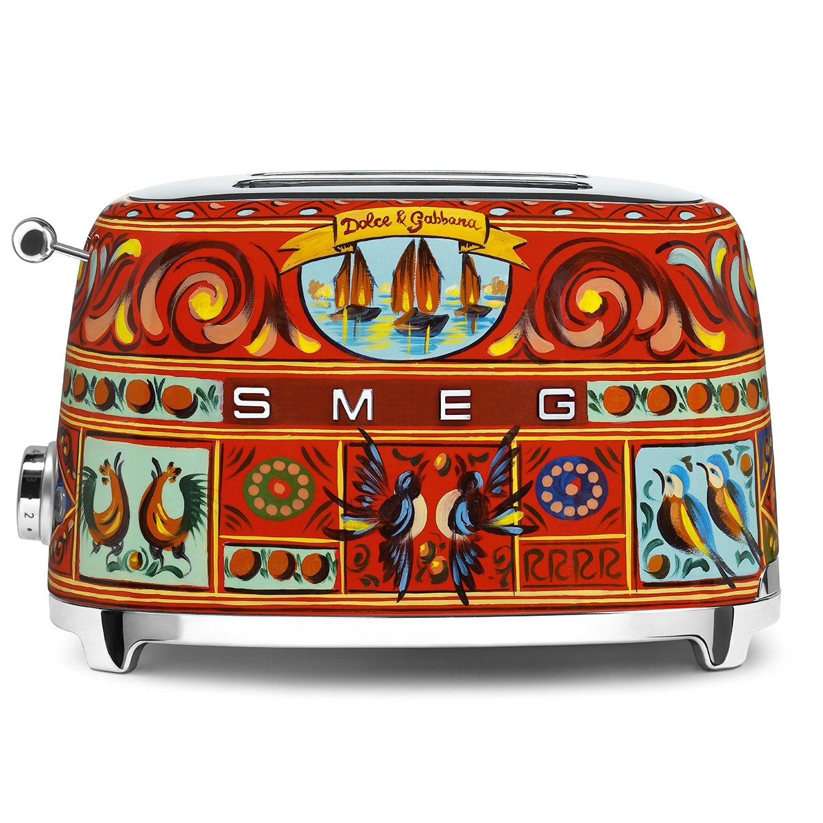 Dolce&Gabbana ja Smeg ovat yhdistäneet luovat voimansa. Sicily is my Love , on uusi ainutlaatuinen projekti Made in Italy. Uusi kokoelma on Smegin tuottama Dolce&Gabbana -tyylillä. Leivänpaahtimet , sitruunapuristimet , espressokoneet , vedenkeittimet , tehosekoittimet , keittiövälineet ja slow- juicerit ovat kaikki nyt koristeltu keltaisilla sitruunoilla, sitrushedelmillä, kaktuksilla ja kirsikoilla, ja ne ovat vain osa tyypillistä sisilialaista koristelua kolmionmuotoisessa kuviossa, jota kutsutaan crocchi -nimellä. Lisäksi valikoimasta löytyy myös jännittävä kukkakuvio, inspiraationaan Italian rannikot ja maisemat, yhdessä kiehtovan Etnan, Castorin raunioiden ja Polluxin kreikkalaisen temppelin kuvien innoittamana. Mukana tunnelmassa ovat myös trinacrie ja cartocci, jotka ovat koristeellisia lehtikuvioita. Leivänpaahdin on valmistettu lakatusta teräksestä ja siinä on erityisen leveät lokerot (36 mm) sekä 6 eri paahtovaihtoehtoa. Jälleenlämmitystoiminto, sulatustoiminto sekä bagelitoiminto – paahtaa leivän vain toiselta puolelta. Pysäytysnapilla voit keskeyttää paahtamisen ja valaistu kromikahva koristaa yhtä lyhyttä sivua. Irrotettava lokero muruille, johdon paikka paahtimen alla ja kumitassut, jotta paahdin pysyy tukevasti paikoillaan. Teho: 950 W Lokeron mitat: 110 x 147 x 36 mm Leivänpaahtimen mitat: 198 x 310 x 195 mm Johdon pituus: 100 cm