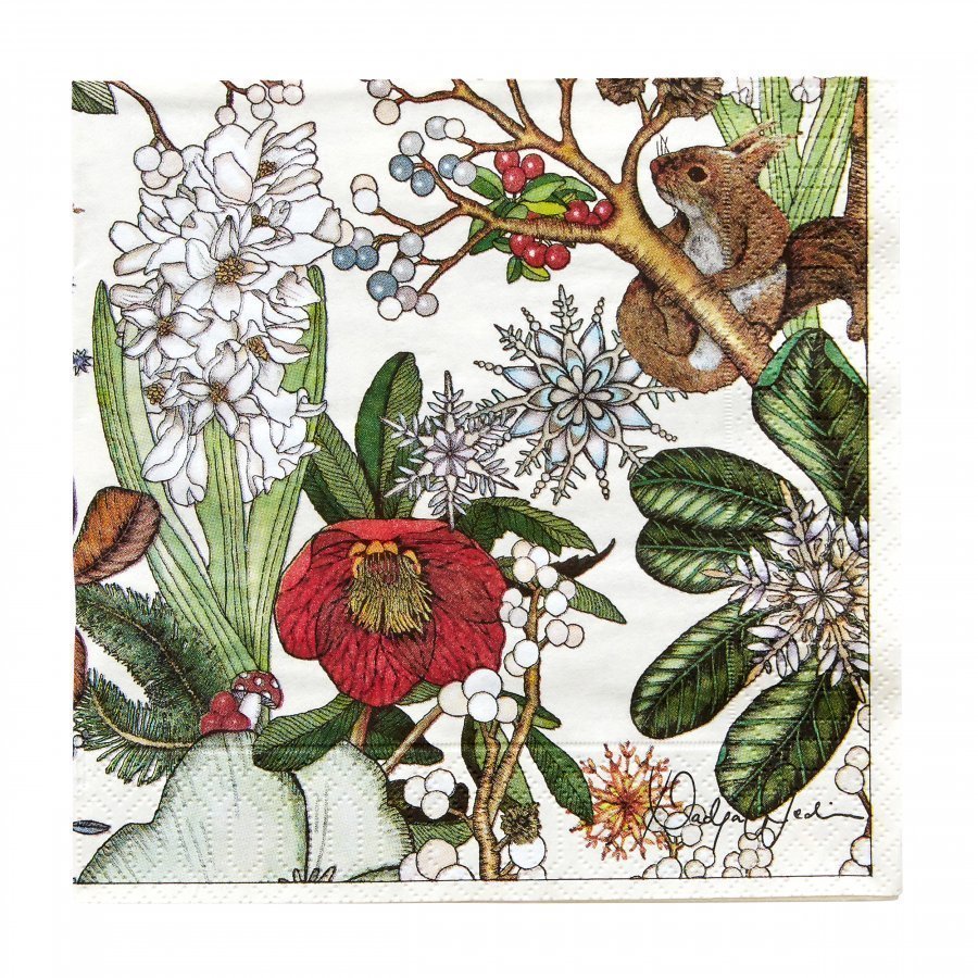 Paperiservettejä, jotka ovat syntyneet yhteistyössä taiteilija, kuvittaja ja muotoilija Nadja Wedinin kanssa. Viimeistele kattaus kauniilla serveteillä. Pakkauksessa 20 kpl.