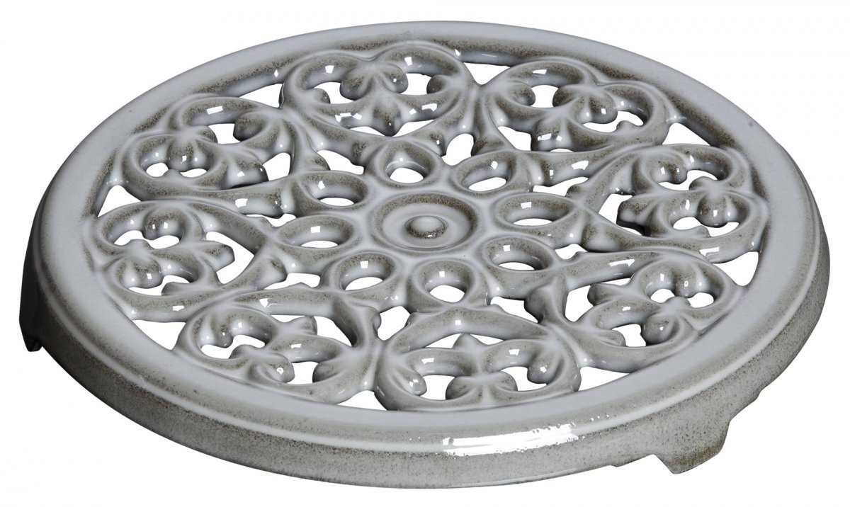 Klassinen pannunalunen Staubilta, jonka halkaisija on 23 cm. Pannunalusta koristaa sydämistä ja liljoista muotoiltu kuvio. Se on valmistettu valuraudasta ja siinä on kolme jalkaa, jotka pitävät sen vakaana.