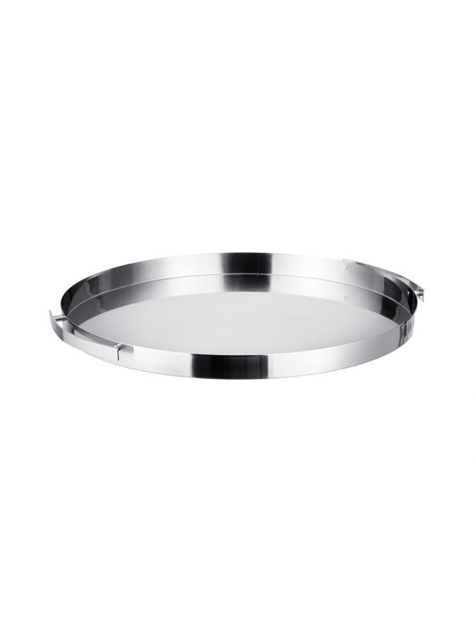 Arne Jacobsenin suunnittelemassa pyöreässä tarjottimessa on kahvat. Materiaali on kiillotettua terästä ja halkaisija 33,5 cm.