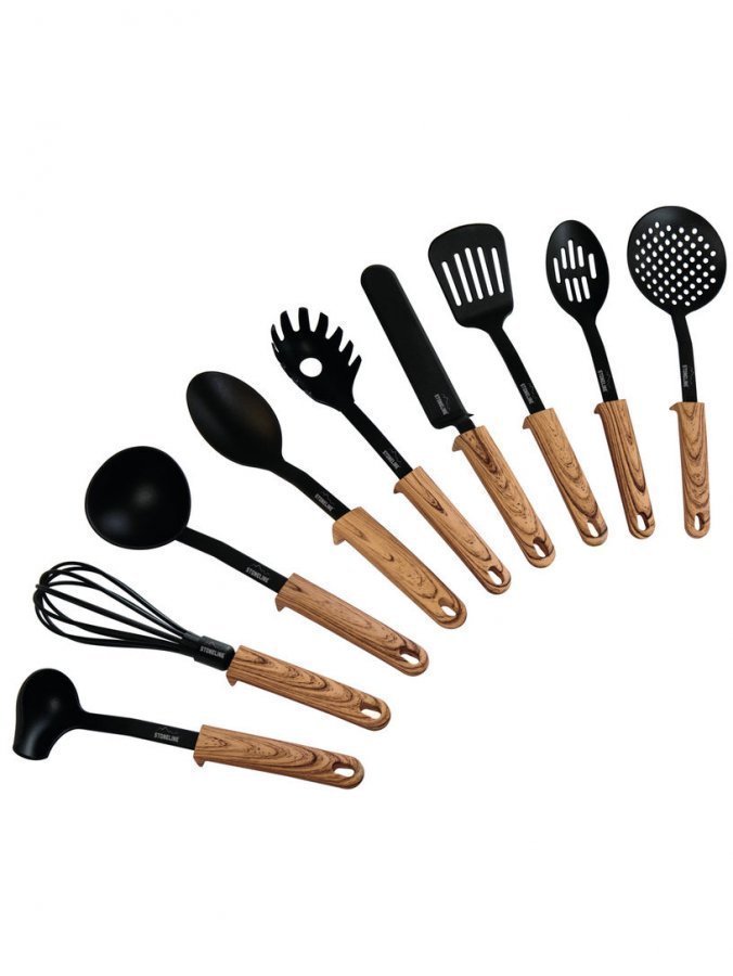 STONELINE-keittiövälinesetti, josta löytyy ruoanvalmistuksessa ja tarjoilussa tarvittavat yleisimmät keittiövälineet. Keittiövälineet soveltuvat käytettäviksi myös pinnoitetuilla paistinpannuilla ja kattiloilla. 9-osaiseen settiin kuuluu: keittokauha, paistinlasta, 2 tarjoilulusikkaa, spaghettikauha, kapea lasta, reikälusikka, pallovispilä ja kastikekauha. Keittiövälineiden pituudet n. 28,534 cm. Materiaali polyamidia ja polypropeenia.