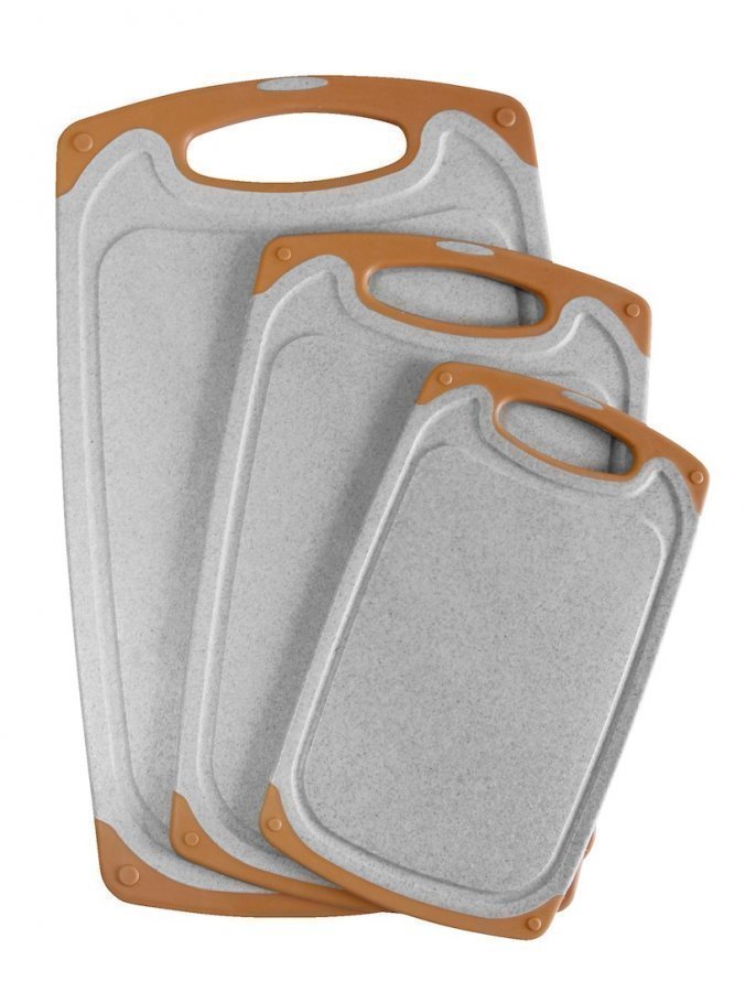 STONELINE®-sarjana leikkuulautasetti. Leikkuulaudat ovat valmistettu muovista, jonka valmistukseen käytetään viljanpuinnista ylitse jäävää silppua. Materiaali muistuttaa ominaisuuksiltaan PP-muovia, jolla on korkea kovuusluokka ja hyvä lämmönkesto. Leikkuulauta on helppo puhdistaa ja sen pinta on miellyttävän tuntuinen. Mitat: 25 x 15 x 0,9 cm, 31,5 x 20 x 0,9 cm, 40 x 24 x 0,9 cm.