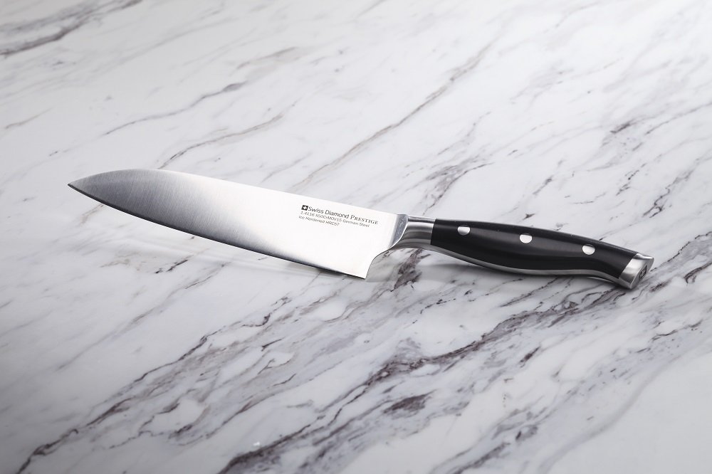 Täydellinen yleisveitsi monimuotoisiin tehtäviin keittiössä. Santoku-veitsi on välimuoto liha- ja kokkiveitselle. Santoku-veitsellä pilkot, silppuat ja kuutioit raaka-aineet käden käänteessä. Laatuveitsi saksalaisesta teräksestä on tasapainoinen käyttää, eikä vastusta nopeita liikkeitä. Veitsi on valettu yhdessä osassa korkealaatuisesta teräksestä ja kahva on valmistettu bakeliitista. Terän paksuus on 2,5 mm. Käsinpesu suositeltavaa ja kuivaa veitsi pesun jälkeen hyvin.