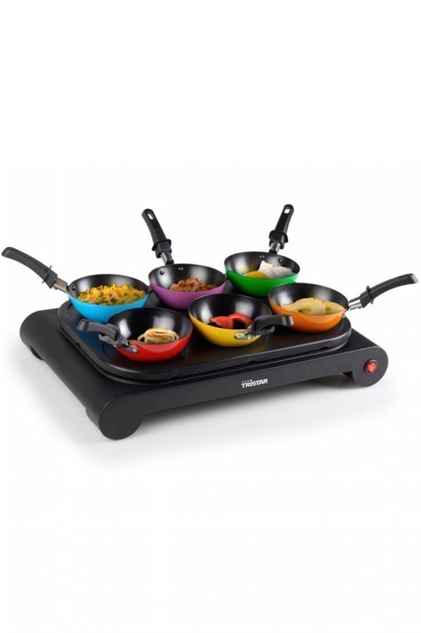 6 hengen wokkisetti, trendikkäät värikkäät pannut. Sopivat myös esim. pannukakkujen ja lettujen valmistukseen. – 6 värillistä wokkipannua – Sileä pinta – 6 integroitua lettupannua – Virtakatkaisin ja virran merkkivalo – 6 hengelle – Paistopinta-ala: 40 x 27,5 cm – Tarttumaton pinnoite – Integroitu lämpöelementti – Integroitu kahva – 6 lastaa – Lusikka – 2 m:n johto – Teho 1000 W