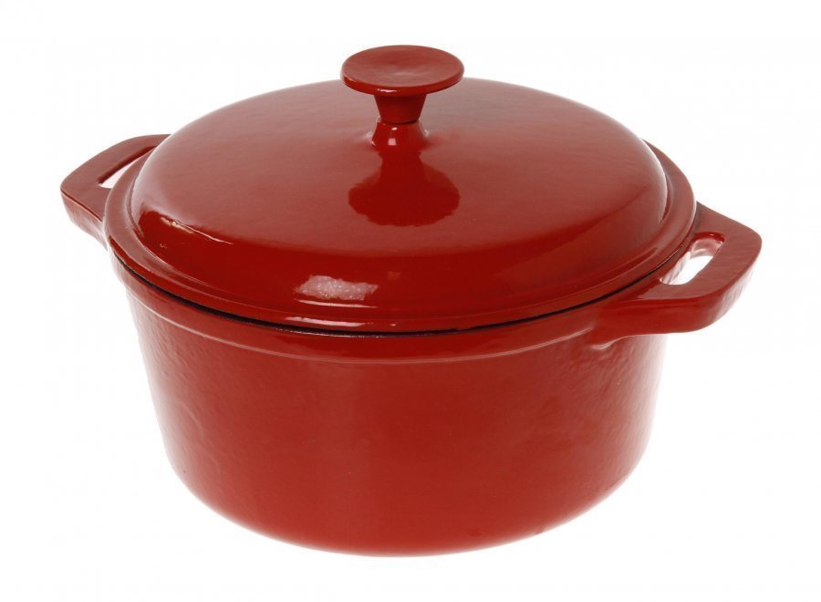 Punainen kannellinen valurautapata ruuanlaittoon.