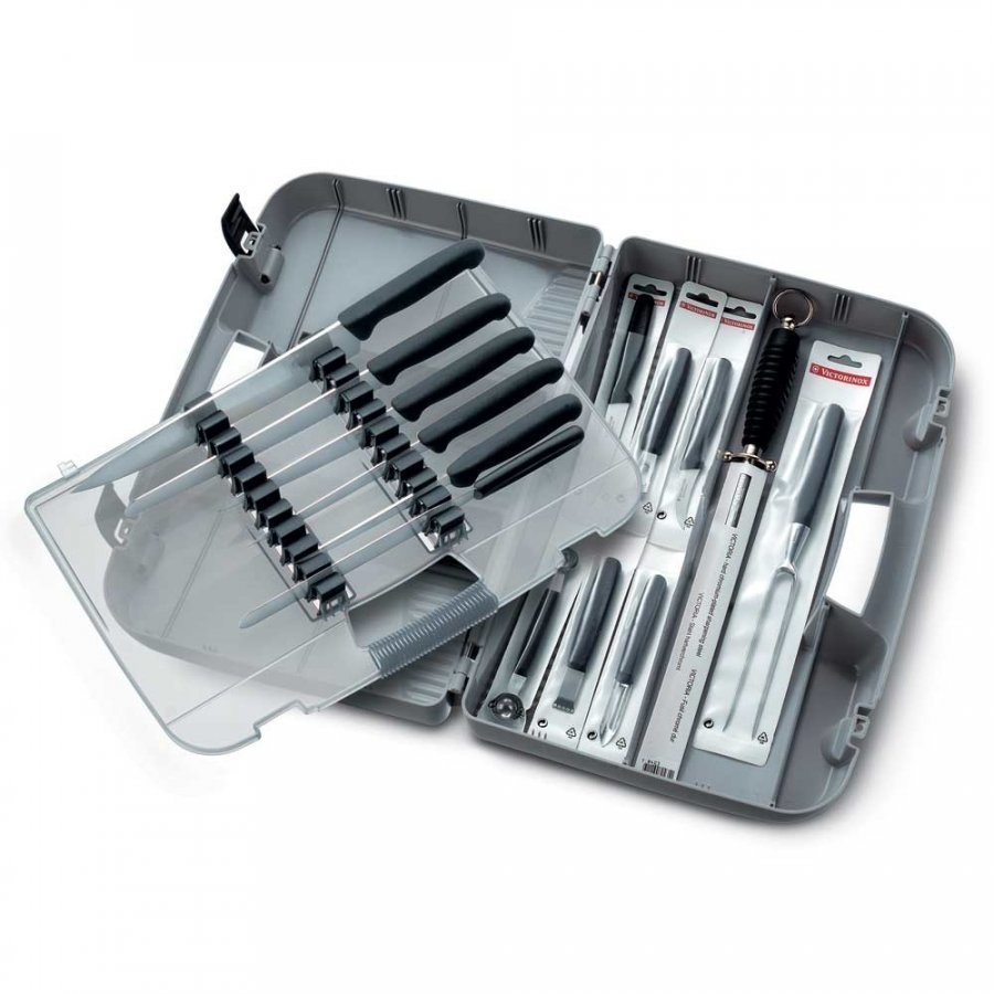 Kokkiveitsisalkku, yksinkertainen, 14 osaa muovisilla kahvoilla & puuvillainen pyyheliina, sisältö: 28 cm Kokkiveitsi leveällä terällä, 26 cm sahateräinen Leipäveitsi, 23 cm joustava Palettilastai, 27 cm pyöreä teroitinpuikko, kuorimaveitsi, kaksiteräinen perunan kuorimaveitsi, peruna pallorauta 2 kauhaa (22 + 25 mm Ø), citrus koristeluveitsi, Kuoriraastin, 12 cm Kokkiveitsi, 15 cm Perkausveitsi.