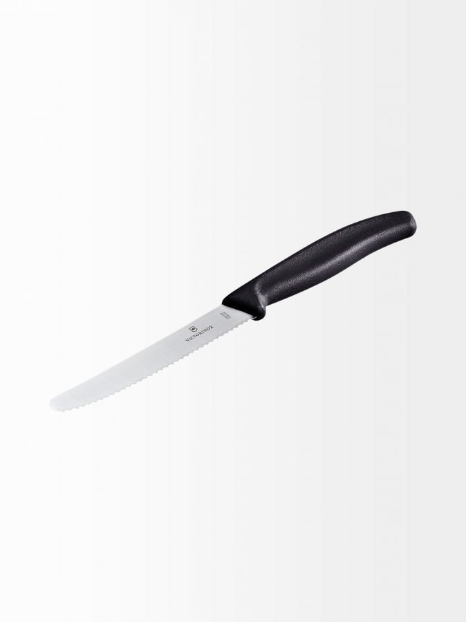 Sveitsiläiset laatuveitset valmistetaan ruostumattomasta Dauphinox-teräksestä ja viimeistellään partaveitsenteräviksi. Konepesunkestävän veitsen sahaterä sopii erityisesti tomaatin leikkaamiseen. Terä 11 cm, kahva muovia.