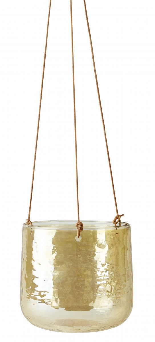Villa Collectionin upea kultainen lasiruukku roikkuu nahkaremmien varassa. Ruukku on halkaisijaltaan 16 cm ja se on saatavilla myös suuremmassa koossa.