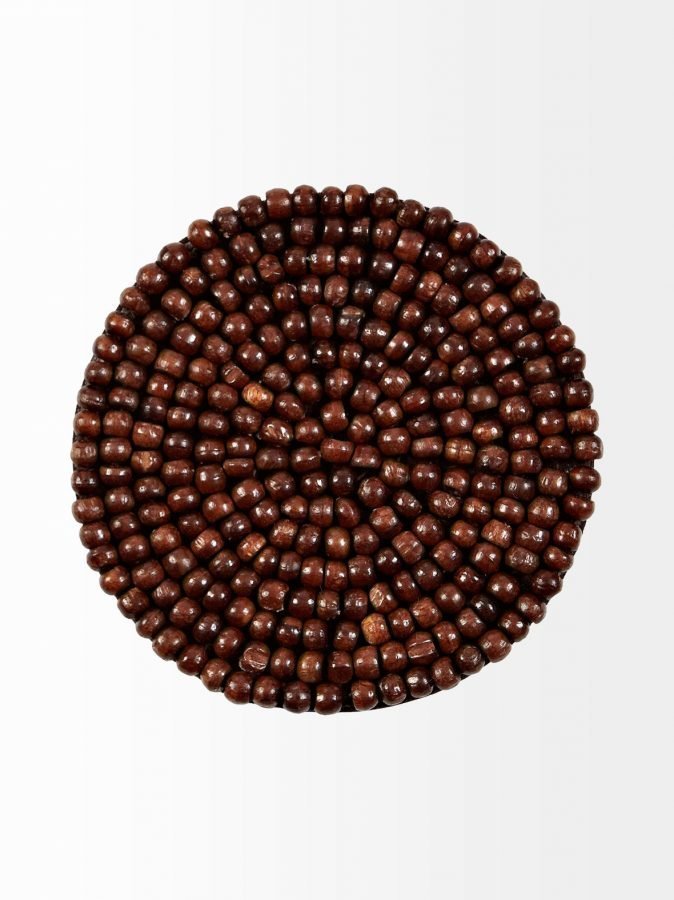 Lasinalusen pinta on puuhelmillä koristeltu. Takaosa on 100 % puuvillaa. Halkaisija on 10 cm.
