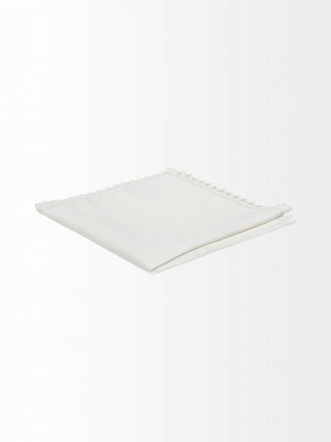 Lautasliinan reunaa kiertää pitsireunus. Materiaali on 100 % pellavaa. Konepesu 40°C.