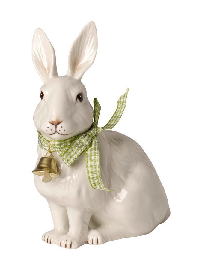 Posliininen pupu viimeistelee pääsiäispöydän. Istuvan jänön kaulassa on pieni metallinen kello.
