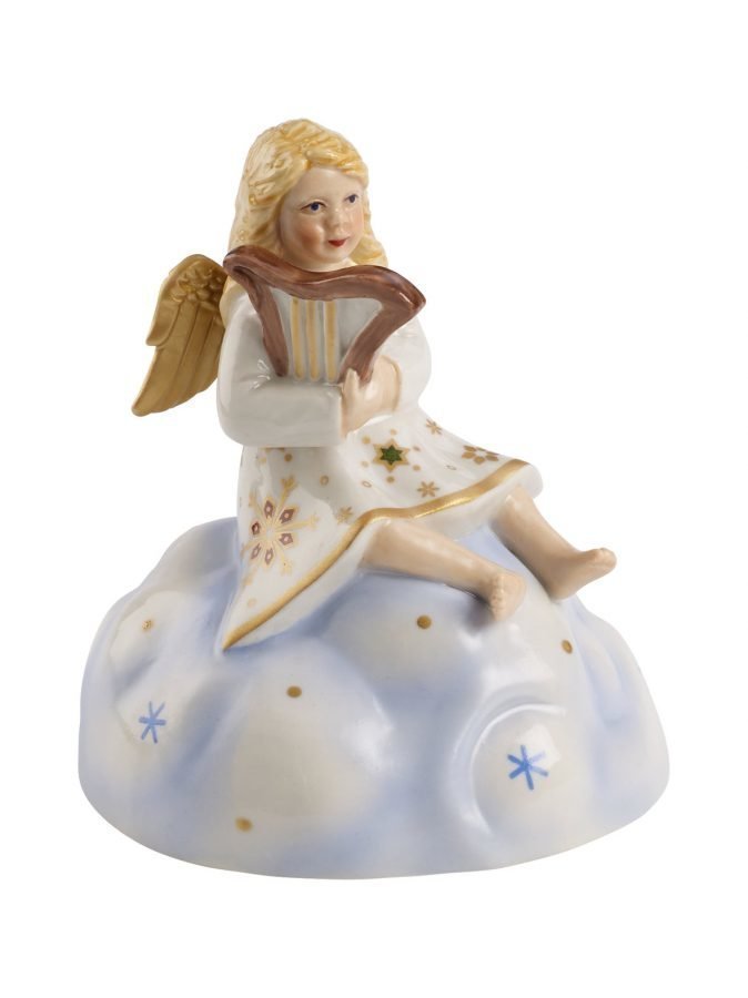 Herkässä koristeessa hymyilevä enkeli soittaa harppua pilven päällä.Materiaali on posliinia.