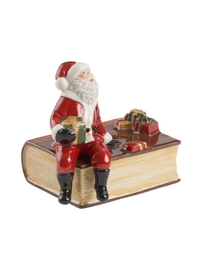 Koristeessa hymyilevä joulupukki lahjoineen istuu suurella kirjalla.Materiaali on posliinia.