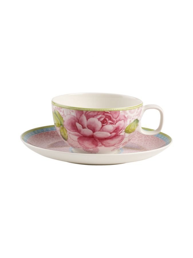Rose Cottage -sarjassa on herkän romanttinen kukkakuvitus, jossa on kevyet pastellisävyt. Teekuppipariin kuuluu pyöreälinjainen teekuppi ja aluslautanen.Materiaali on laadukasta, konepesun ja mikroaaltouunin kestävää posliinia.
