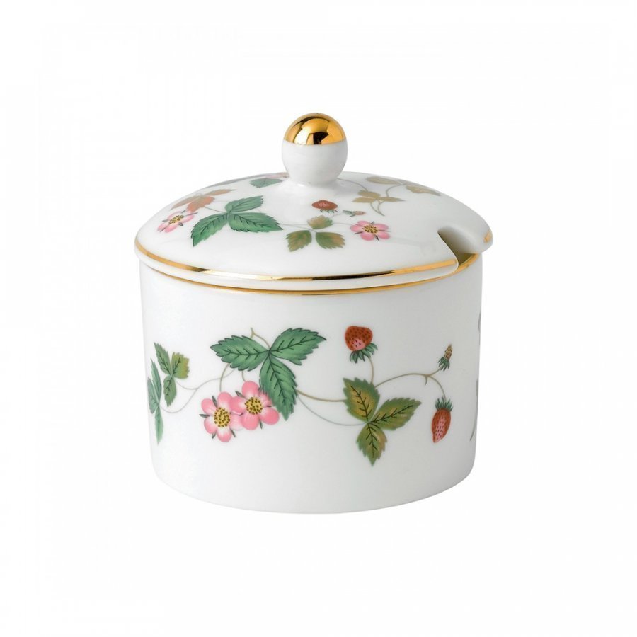 Wild Strawberry-sarjassa on käsinmaalattuja lehtiä, kukkia ja mehukkaita punaisia mansikoita. Kiiltävä reuna on 22-karaatin kultaa.