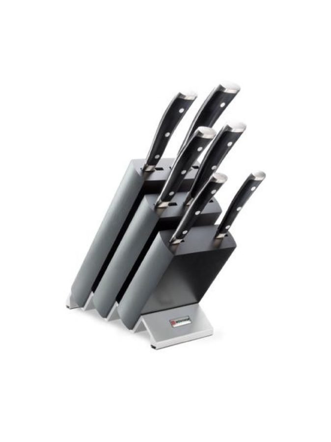 Jykevä puutukki suojelee teriä ja antaa ilmettä keittiöösi. Tukissa on kuusi veistä, terän pituus suluissa: santokuveitsi (17 cm), kokinveitsi (20 cm), leipäveitsi (20 cm), makkaraveitsi (14 cm) ja kaksi eri kokoista pilkkomisveistä (9 ja 16 cm). Tukki on pyökkiä, terät ovat ruostumatonta terästä. Käsinpesu. Tukin mitat ovat 24 x 11 x 24 cm.