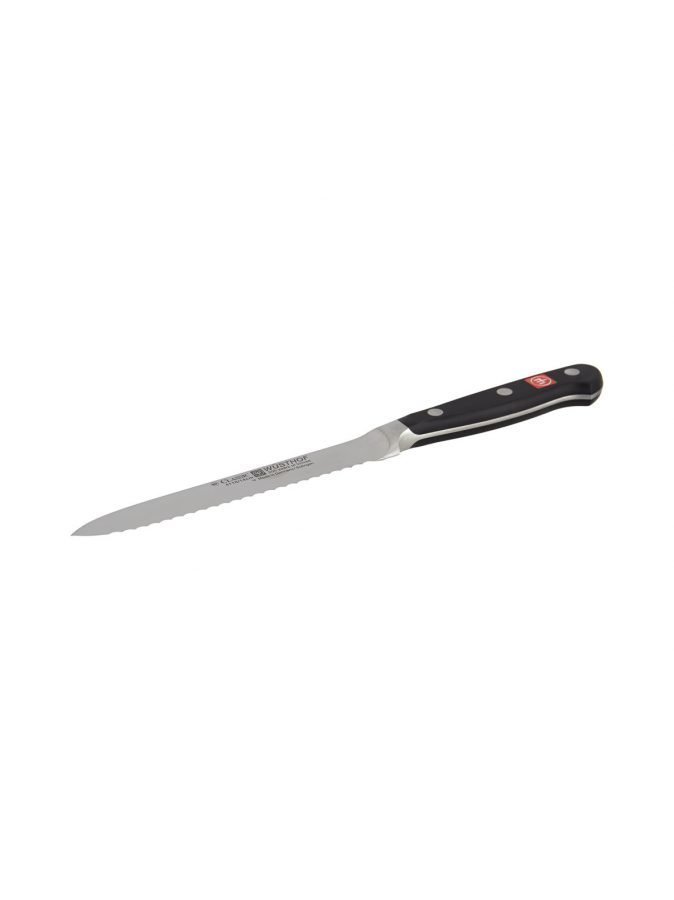 Laadukas, vaativaan käyttöön suunniteltu veitsi on valmistettu Saksassa. Ergonomisesti muotoiltu kahva on suunniteltu yhteistyössä ammattikokkien kanssa. Sahalaitaterä on ruostumatonta terästä, pituus 14 cm. Konepesunkestävä, mutta valmistaja suosittelee käsinpesua.4110-7
