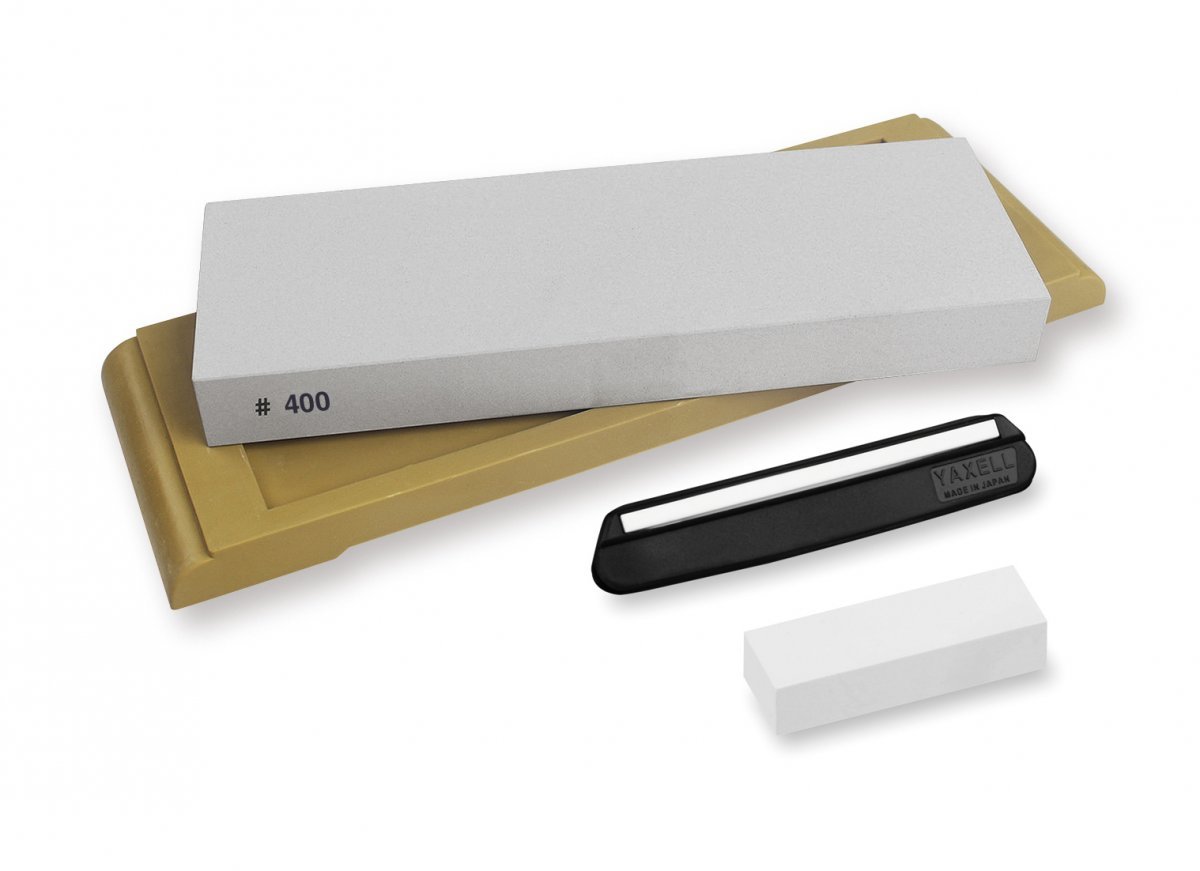 Karkea keraaminen hiomakivi, karkeudeltaan 400 Grit. Kivessä on kumijalka, jotta se pysyy paikallaan kun teroitat veitset. Hiomakivellä saat naarmut ja kolhut hiottua pois veitsen terästä. Mukana tulee myös pieni tasoituskivi, jolla saat pidettyä itse hiomakiven tasaisena. Muovista kulmatukea keraamisilla liukupinnoilla käyttämällä hiomakivi kestää pidempään.
